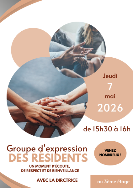 Dans le cadre de notre démarche d’amélioration continue et de bientraitance, la résidence met en place des groupes d’expression trimestriels, animés par la directrice, à destination des résidents volontaires.