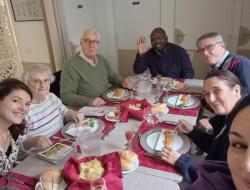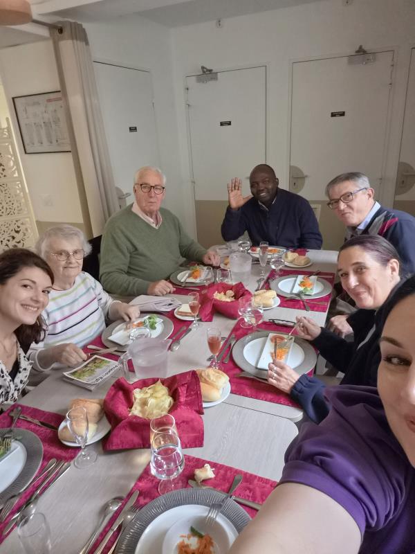 La dynamique se poursuit au fil des rencontres : selon les semaines, des invités extérieurs viennent enrichir ces repas. Sur la photo, par exemple, le prêtre de La Ferté-sous-Jouarre a partagé un moment chaleureux autour de la table, illustrant la volonté d’ouverture de la résidence sur la vie locale et spirituelle.