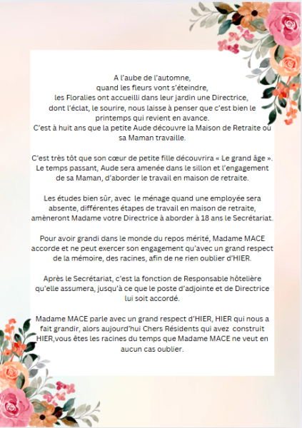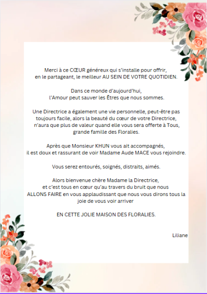 Pour accueillir, Aude, notre nouvelle directrice de l'EHPAD les Floralies située à la Ferté-sous-Jouarre, Liliane (toujours inspirée et joueuse avec les mots) nous offre un joli moment de partage.